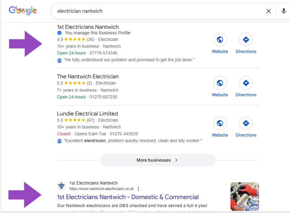 “Not only did our website climb to the top of the organic results, but we also began appearing in the map pack. That double visibility has driven a huge uplift in calls and footfall.” - Rob, 1st Electricians