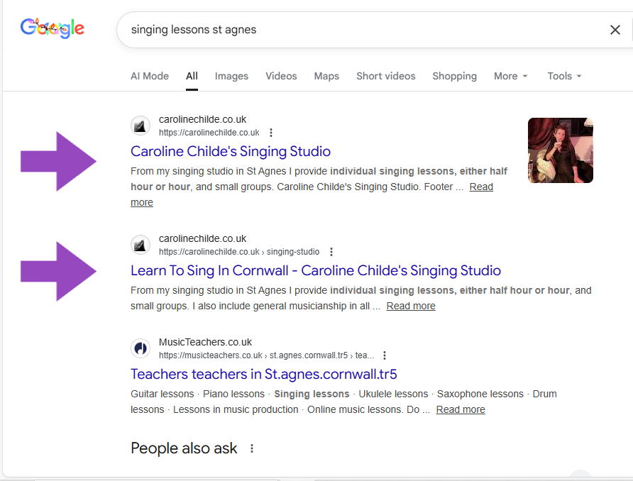 “Domination of the first page was exactly what we needed. Having multiple listings at the top gives us so much more visibility than our competitors and enquiries have soared.” - Caroline Childe, Singing Coach